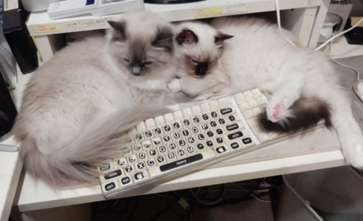 “Sierra” (at 4 months) and “Canyon” are napping on Frank’s computer.