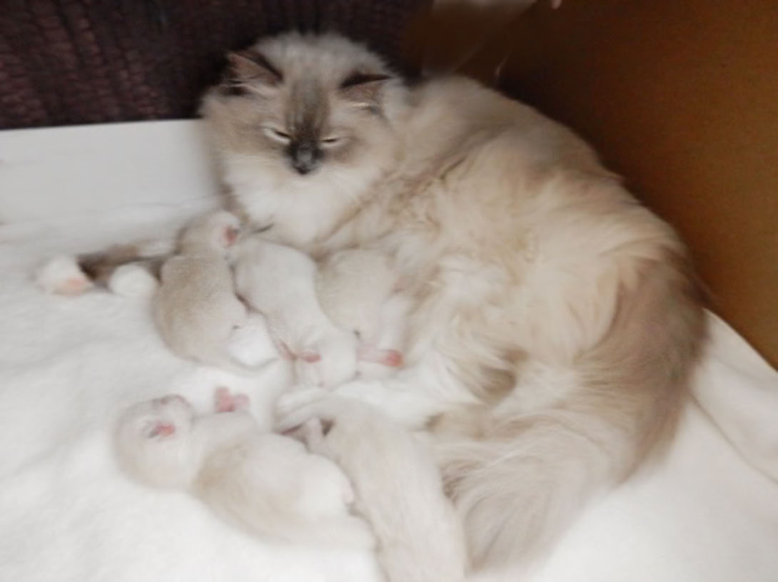 “Sierra” is pictured with her first litter. Her kittens are three days old.