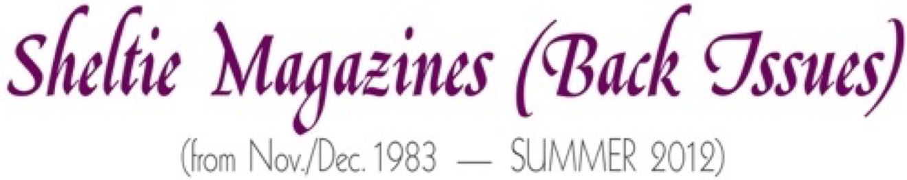 November/December 1984 ($10.25; 3 left) — GREAT AMERICAN SHELTIES—Ch Golden Prince of Timberidge; OBEDIENCE TRAINING: ENJOYMENT OR A COMPULSION TO WIN?; "WHISKER" TRIMMING IN SHOW DOGS: A HARMLESS COSMETIC PROCEDURE OR MUTILATION OF A SENSORY SYSTEM?; THE SCHMIDT METHOD OF SHELTIE GROOMING: PART IV—GROOMING FOR SHOW; A PET OWNER'S GUIDE TO THE DOG CRATE; INHERITED BLEEDING DISORDERS; CANINE VAGINAL FLORA: A TECHNIQUE FOR SAMPLING AND CLINICAL OBSERVATION; INTERNATIONALLY SPEAKING—The Sheltie "Scene" in Singapore; THE PHOTO CLINIC—Eyes and Heads; SHELTIES AND THEIR OWNERS DO THE DARNDEST THINGS: Windrem's Golden Taffeta, CDX. (120 pgs.)